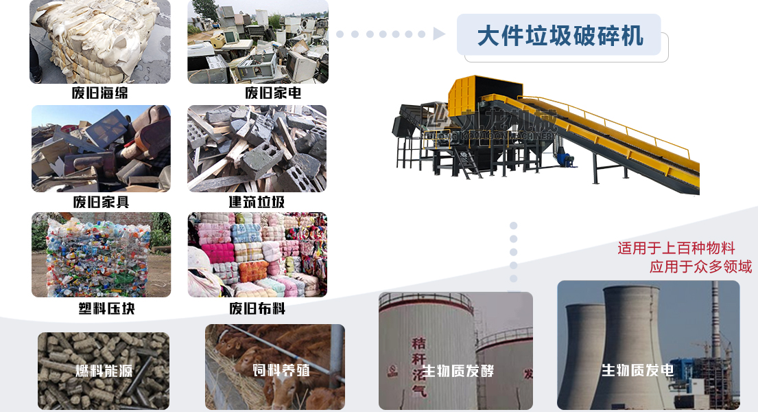 适用范围: 废旧床垫、沙发、废旧家具、冰箱、家电、装修垃圾、园林垃圾、包装垃圾等大件生活废弃物。